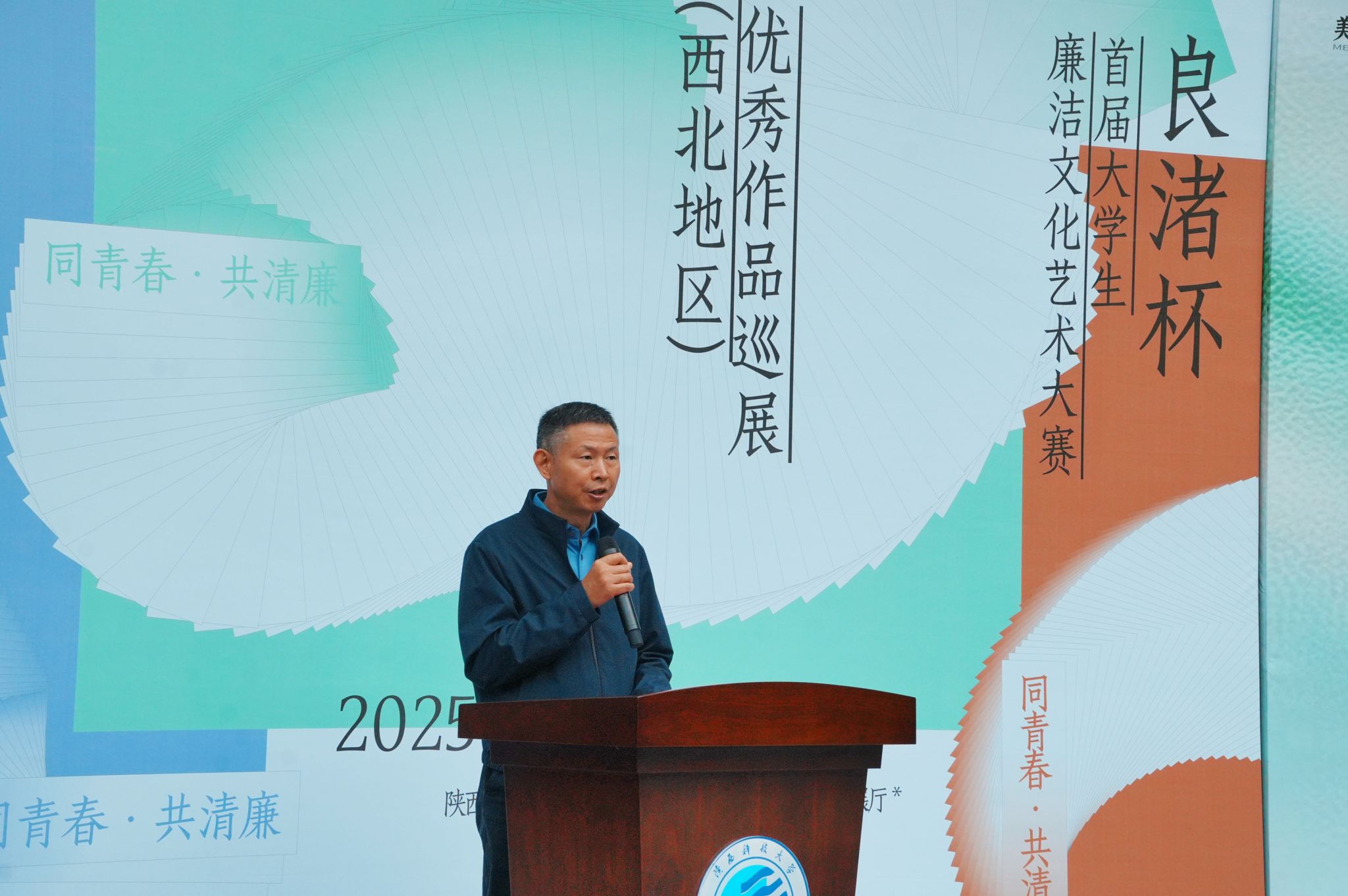 陳于杰在致辭中簡要介紹了“良渚杯”首屆大學生廉潔文化藝術大賽的情況,指出此次巡展是歷次巡展中規模最大、參展作品最多的一次,立體呈現了大賽的豐富成果。此次巡展與陜西科技大學第六屆廉潔文化藝術作品大賽優秀作品展同期舉行,希望能將大賽的成果和精神傳遞給更多的院校和師生,推動廉潔教育與藝術教育深度融合,讓廉潔文化在全學科中生根發芽。