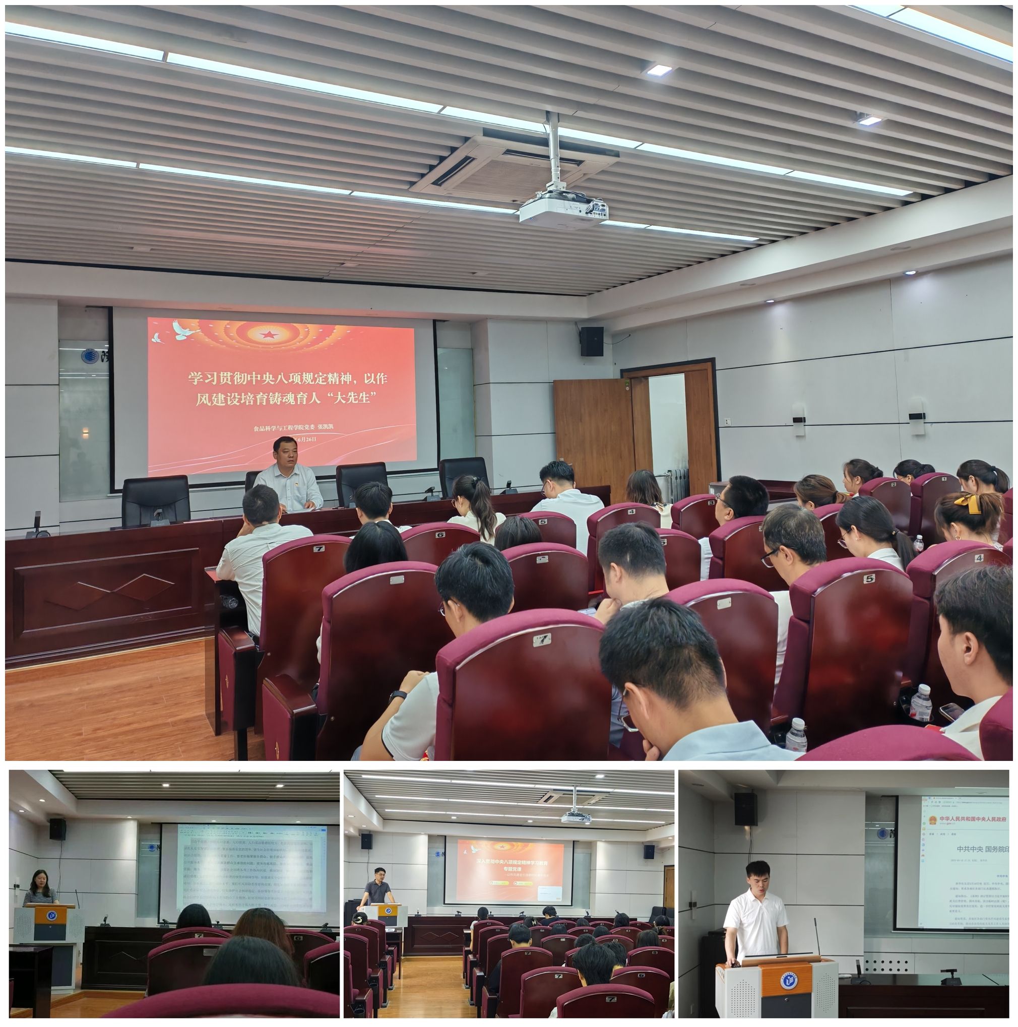 七一前夕,學院領導班子和各師生黨支部書記分別講授深入貫徹中央八項規定精神學習教育專題黨課。學院黨委書記張凱凱以《深入學習貫徹中央八項規定精神,以作風建設培育鑄魂育人“大先生”》為題進行授課,系統闡釋了教育領域踐行中央八項規定精神的重要意義。學院黨委委員、各師生黨支部書記圍繞深入貫徹中央八項規定精神學習教育心得體會,結合分管領域工作及支部特點講授專題黨課,持續推動中央八項規定精神在食品學院落地見效.