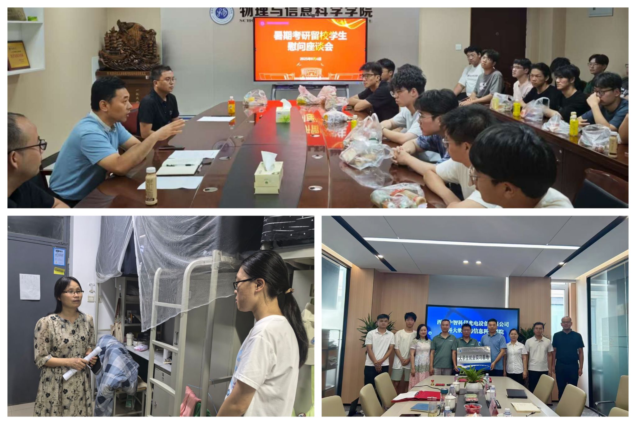 聚焦學(xué)生需求,延伸育人“服務(wù)鏈”。針對暑期考研學(xué)生復(fù)習(xí)場地緊張的問題,學(xué)院積極協(xié)調(diào)實驗室、會議室等空間開辟為考研自習(xí)室,并配備桌椅、飲用水、網(wǎng)絡(luò)等基礎(chǔ)物資,為學(xué)生提供安靜便捷的學(xué)習(xí)環(huán)境。假期中段,學(xué)院專門召開“暑期考研留校學(xué)生慰問座談會”,院領(lǐng)導(dǎo)、系主任及輔導(dǎo)員與學(xué)生親切交流,傾聽備考困惑與需求,既為大家加油鼓勁,也送上貼心慰問品,讓學(xué)生在專注復(fù)習(xí)時更能感受到學(xué)院的溫暖。同時,學(xué)院專程前往中智科儀等企業(yè),看望慰問暑期在企實習(xí)學(xué)生,實地了解他們的實習(xí)環(huán)境與實際需求,為學(xué)生實習(xí)實踐全程保駕護航。