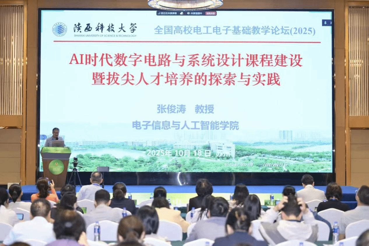 10月18至19日,第二屆全國高校電工電子基礎教學論壇在蘇州召開,電智學院張俊濤教授受邀以“AI時代數字電路與系統設計課程建設暨拔尖人才培養的探索與實踐”為主題做專題報告,報告受到與會教師的一致好評。