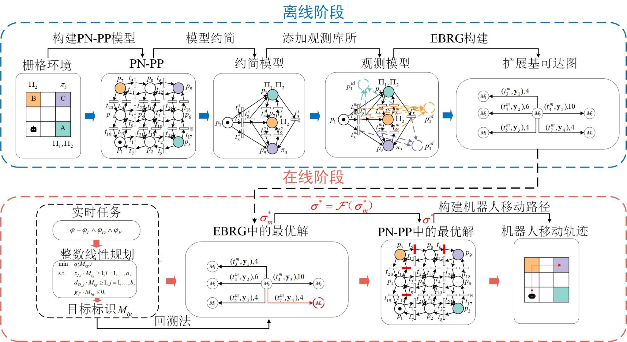 針對上述難點,本研究團隊提出了一種基于Petri網(wǎng)的多機器人系統(tǒng)最優(yōu)路徑規(guī)劃方法。通過將多機器人系統(tǒng)抽象為圖形化的Petri網(wǎng)模型,并設計結構控制器,實現(xiàn)復雜任務約束的形式化表征。為避免機器人數(shù)量增加而引發(fā)狀態(tài)爆炸問題,提出一種狀態(tài)空間壓縮方法和高效的實時在線規(guī)劃算法,實現(xiàn)多機器人復雜任務的實時分配和最優(yōu)路徑規(guī)劃。理論分析與數(shù)值實驗均表明,該方法在保證規(guī)劃最優(yōu)性的同時,顯著提升了計算效率和可擴展性,尤其在機器人數(shù)量和環(huán)境規(guī)模不斷增加的情況下,表現(xiàn)出優(yōu)于現(xiàn)有方法的性能。